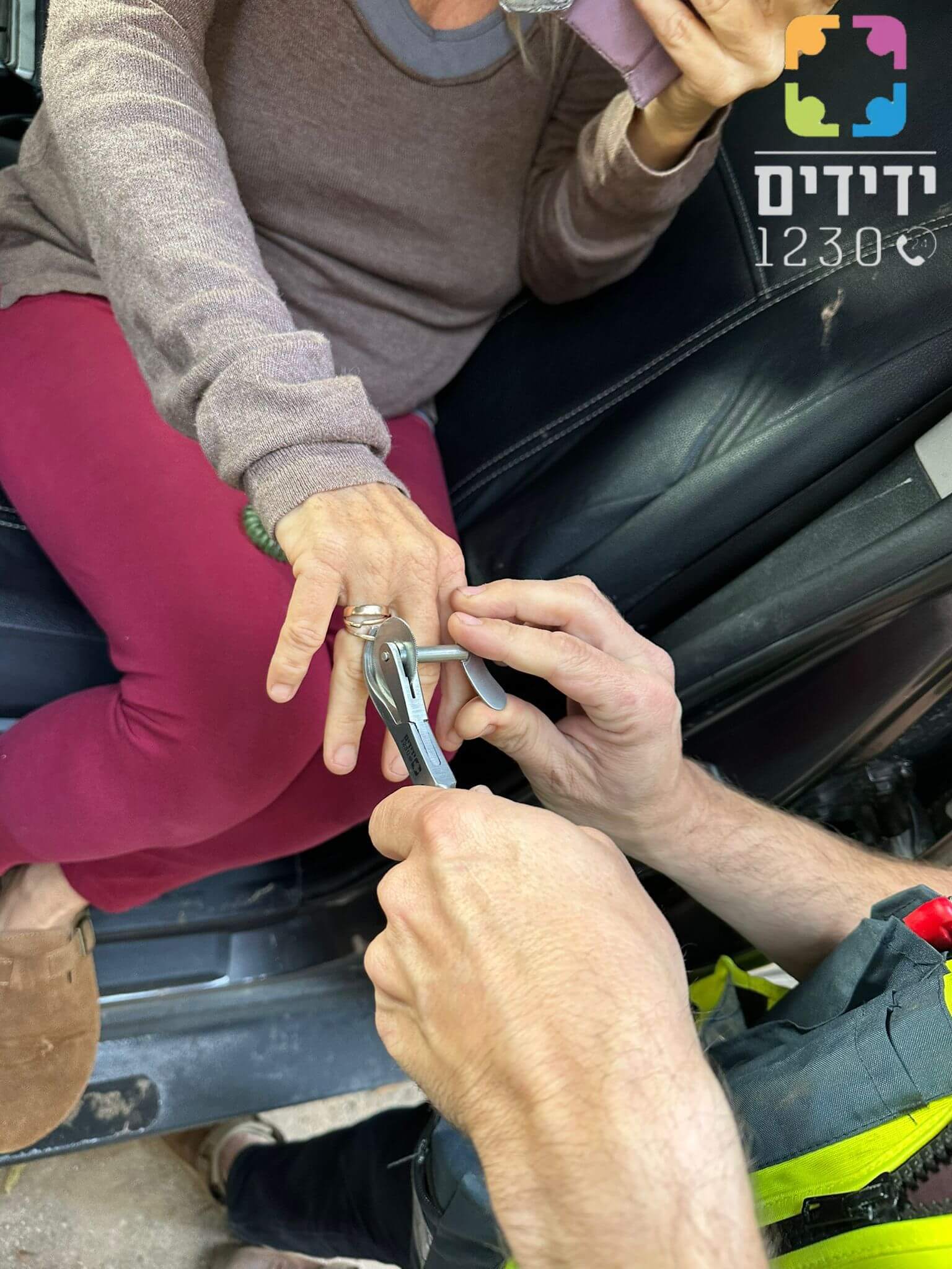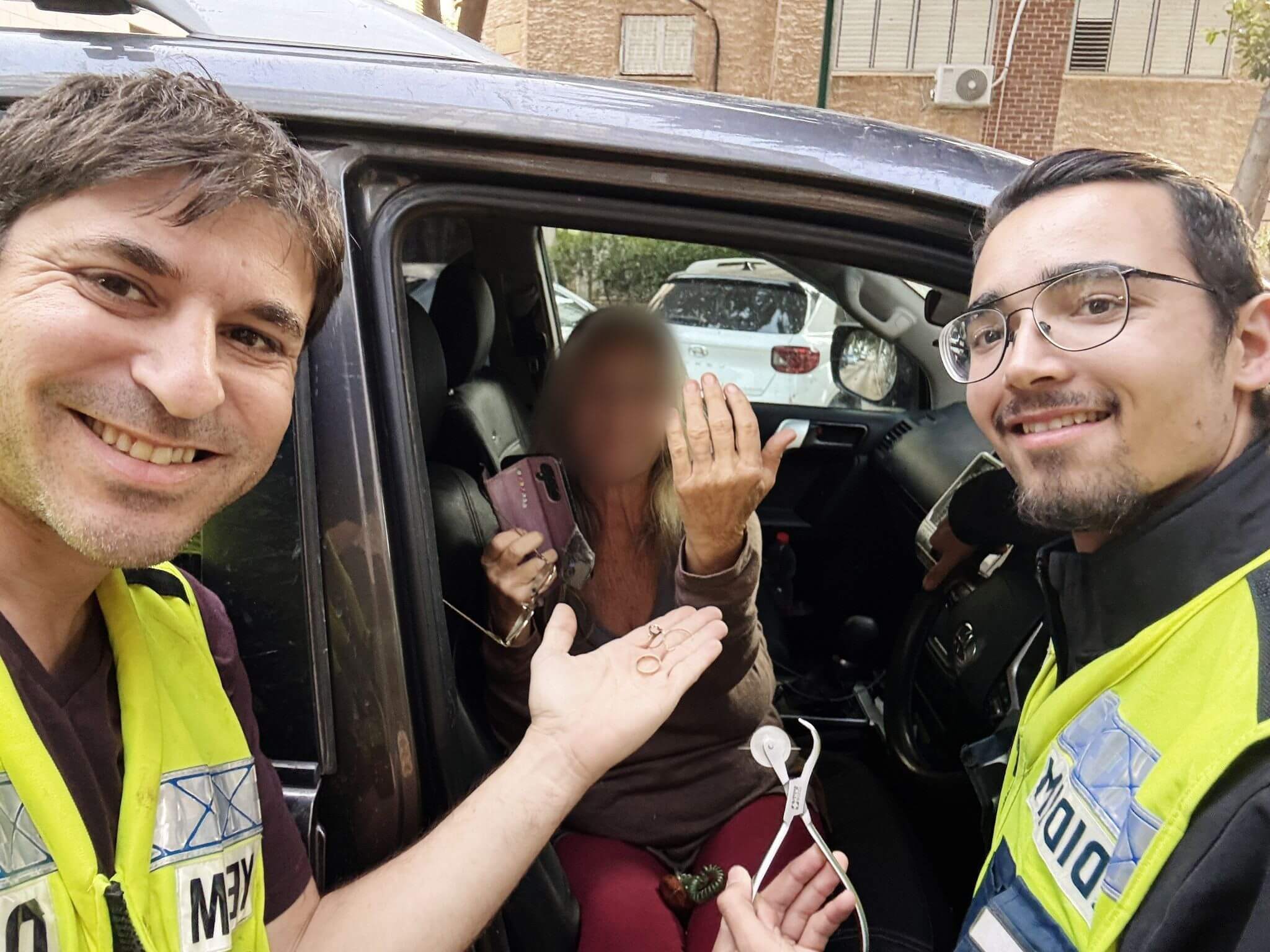 אמיר סובול ויאיר ליימן, מתנדבי הסניף המקומי, נענו לקריאה והגיעו במהירות למקום. בעדינות וסבלנות רבה, עמלו השניים עד לחילוץ הטבעת מן האצבע בשלום וללא פגיעה בגברת.